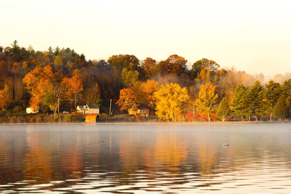 Burlington, Vermont, offers a picturesque setting to view fall foliage, with its brightly colored trees lining the city’s historic streets and charming waterfront. The mix of red maples and yellow birches creates a canvas that invites a leisurely stroll.